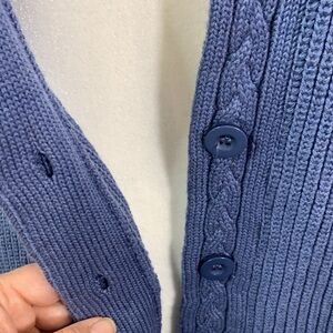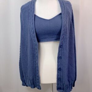 Gorgeous cornflower blue cable knit cardigan with matching crop top. This sweater is unbelievably soft and buttery. There are many fine details from the hidden front button closure for a clean, buttoned up look, to the exaggerated sleeves with double cable detailing down the sides. Inside, at the cardigan shoulder you will find straps to keep the cardigan and crop top in place (final photo). Alternately you can wear the sweater off the shoulder to display the braided detail of the tops strap. This is such a well thought out piece. Great look open or buttoned up, you can show a lot or wear it a bit more conservatively. Would look great with any of your favorite accessories and jeans!