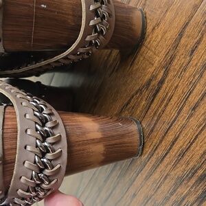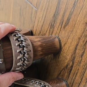 Heel has some wear on back but is mostly from the belt detail that covers it. See photos for scuffs and wear