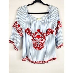 Gianni Bini Embroidered Peasant Blouse L Blue Boho Off the Shoulder Stripe Beach