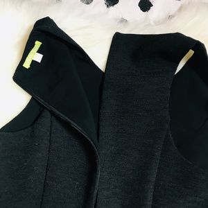 Zipper in the front at chest and also a zippered back closure.