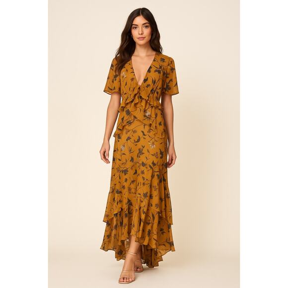 This beautiful Gianni Bini women’s maxi dress features a romantic floral print on a warm camel/brown background with layered ruffle details. Lightweight and flowy, with short flutter sleeves and a tiered hemline. Perfect for weddings, events, parties, vacations, or boho styling.