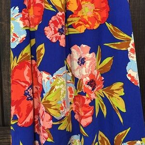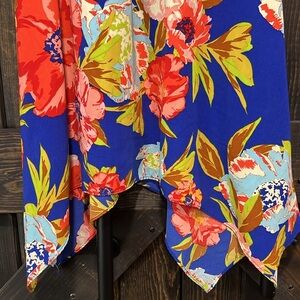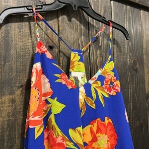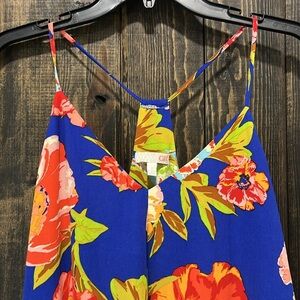 GB brand floral mini dress. Size small. Thin straps. Blue with beautiful flower print. Tropical / Hawaiian vibes. Great for Spring & Summer. Handkerchief hem. Preloved. Please see all photos for condition.