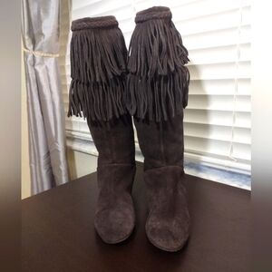 Women's GIANNI BINI Suede Fringe Boho Tall Boots BROWN