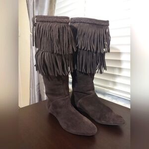 Step out in style with these chic fringe suede boots. Perfect for adding a touch of flair to any outfit.