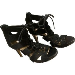 Elevate your style with these stunning black strappy sandals from Gianni Bini. These pre-owned heels feature an almond toe shape and a zip closure. The ultra-high stiletto heel adds a touch of elegance to any outfit.