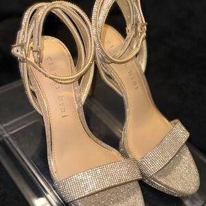 Elevate your style with Gianni Bini's stunning gold heels, featuring a dazzling glitter finish and elegant ankle straps. Perfect for special occasions, these heels combine sophistication and glamour, ensuring you make a memorable entrance.
