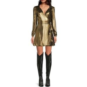 Gianni Bini Shimmer and shine in this stunning gold wrap dress from Gianni Bini! Perfect for holiday parties, special occasions, or a glamorous night out.