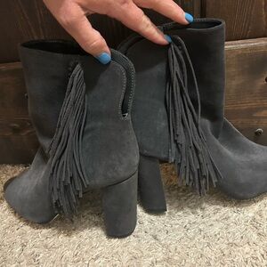 Elevate your style with these Gianni Bini heeled boots, featuring a chic gray hue and playful fringe details. The high, chunky heel and peep-toe design offer a modern twist on classic booties, while the side zipper ensures easy wear. Perfect for adding a touch of sophistication to any ensemble. Gently used, excellent condition, only worn a couple of times.