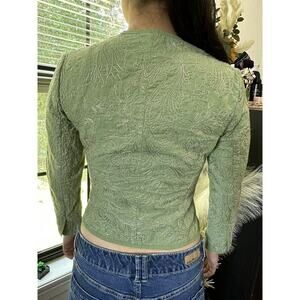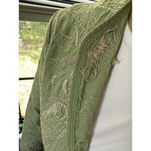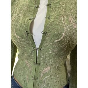 Gianni Bini, lightweight, green blazer with beige embroidery. Slight Mandarin collar. Small split cuff and hem. Hook and eye closure. Missing brand tag. Care instructions attached. Made in Vietnam.