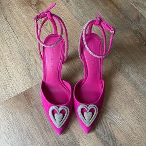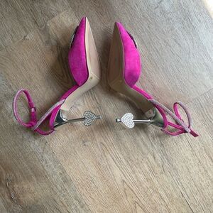 • Details: Hot pink suede, rhinestone hearts, crystal ankle straps, pointed toe, stiletto heel