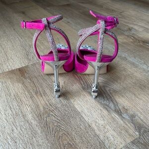 Turn heads in these stunning Gianni Bini pink suede heels! Featuring rhinestone heart details at the toe and heel, crystal ankle straps, and sleek silver stiletto heels with a rhinestone heart accent. The ultimate statement shoe for date night, parties, or your next Barbiecore moment.
