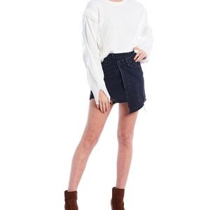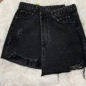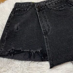 Distressed black Washed denim asymmetrical wrap jean skirt! Funky V waist, 5 pocket design with raw hemline and front button/ side button closure. Edgy and so much fun to style!
