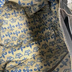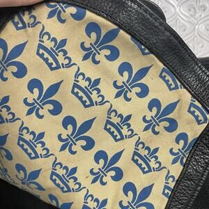 Excellent condition Gianni Bini black leather messenger bag, crossbody style with large flap opening, interior lining is a gold/tan and blue fleur de lis pattern