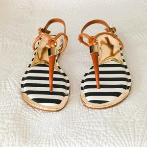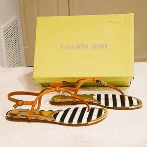 Gianni Bini Nautical Flat Sandals 9M Navy & White T Strap Tan Leather