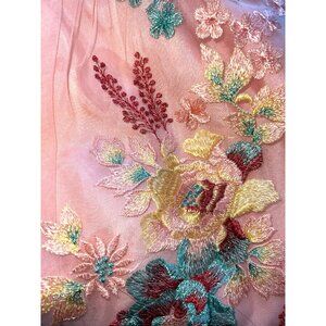 This apricot Gianni Bini off-shoulder dress features stunning floral embroidery on a fit-and-flare silhouette. The bodice includes delicate draping, complemented by a full skirt with intricate detail.