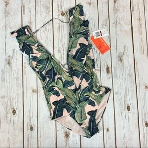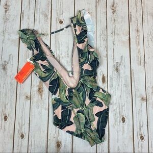 NWT Gianni Bini Palm Print Ruffle Plunge Swimsuit