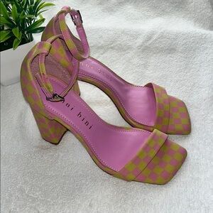 These Gianni Bini heels feature a playful pink and yellow polka dot design, complemented by a chunky block heel and an elegant ankle strap. The open toe and substantial heel height make them a standout choice for any fashion-forward occasion.made in Brazil