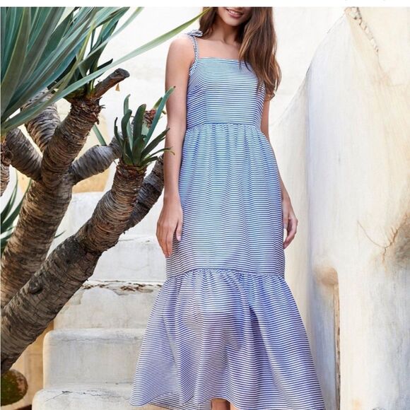 Blue/white stripe maxi dress, back zipper, 3 tier layer, fully lined, adjustable tie straps.