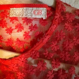A perfect red lace and lined dress in size 6, lined with peekaboo in front above waistline. Made by Gianni Bini. Dress is 100% Polyester and can be hand washed and hung to dry. Zips up the back. It’s like new and ready to spark some romance.