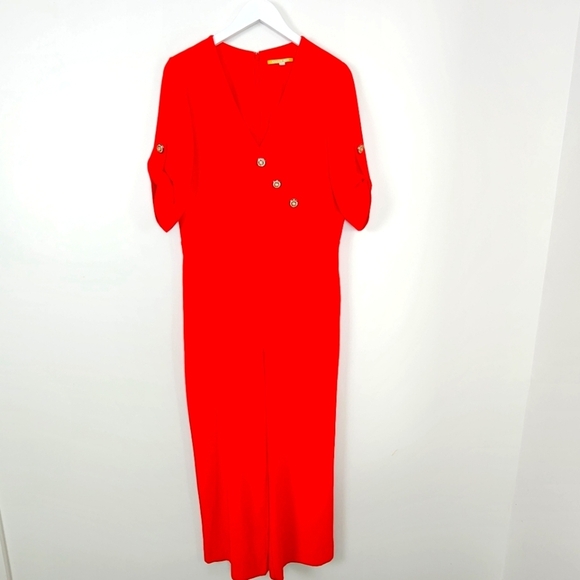 The Gianni Bini Red V-Neck Pockets Tab Short Sleeve Jumpsuit in size 12 is a stylish one-piece outfit perfect for a party, night out or cocktail event. The jumpsuit features a solid red color with a V-neckline and short sleeves, giving it a modern and trendy look. Made from polyester crepe fabric, this wide-leg jumpsuit also includes button detailing, convenient side pockets, and a zipper closure for easy wear. Perfect for a city-inspired theme, this jumpsuit is designed to make a statement and turn heads wherever you go.