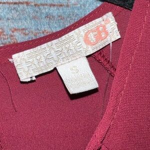 New with tags. GB romper. Size small. Burgundy / wine color with blue floral designs. Very pretty! Feminine details. Mesh, ruffles, flared tier sleeves. Sheer neckline. Dressy look. Great for a night out. Boho.