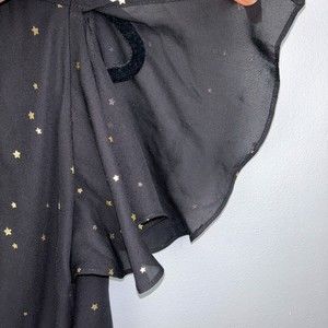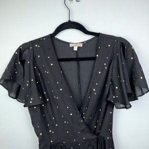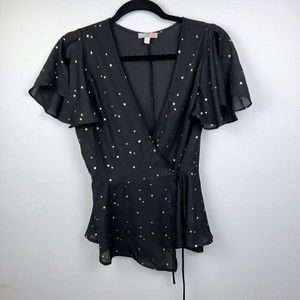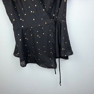 Gianni Bini Sheer Black Wrap Top Gold Star Print Split Flutter Sleeve Women's M