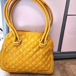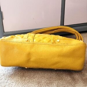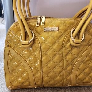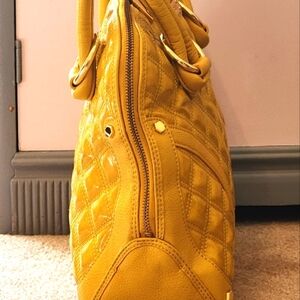 Quilted leatherette Exterior with striped cloth interior. Amazingly roomy with lots of interior pockets of varying sizes.