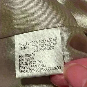 Hook and eye closure is no longer attached. Interior brand label is loosely attached. Gently used, no major flaws!