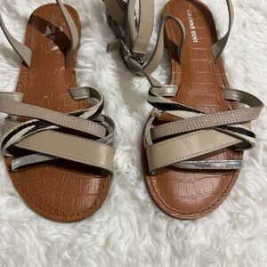 Stylish Gianni Bini sandals with strappy design. Features a mix of tan and brown colors.