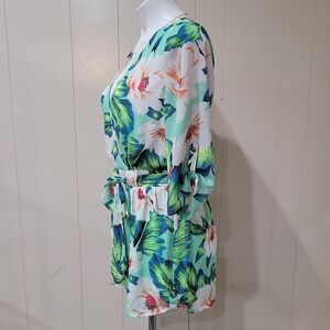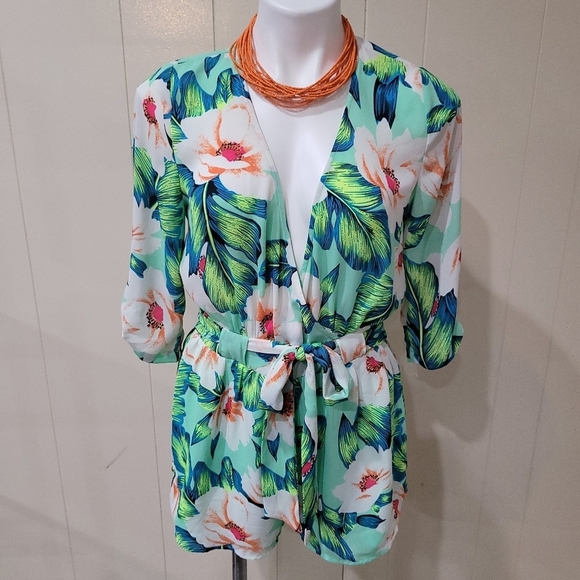 Gianni Bini Tropical Floral Romper Long Sleeve Plunge Neck Shorts Sz S. 36" chest, 28" waist, 28" long. Please see photos for details. Belt included.