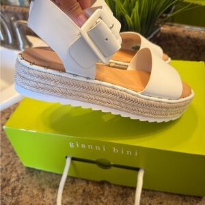 Elegant white espadrille sandals by Gianni Bini. Features a stylish buckle and woven platform.