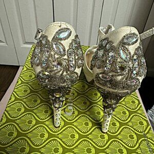 Beautiful 4 1/2 inch white stiletto heels with dazzling crystals and beading on the back. Platform front with buckle closure.