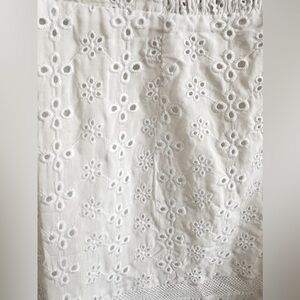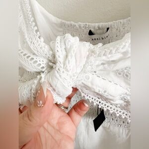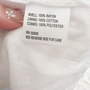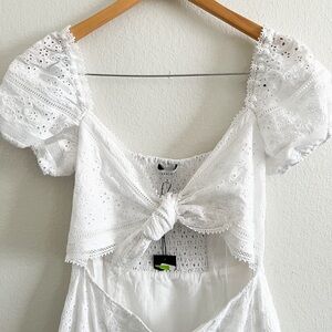 Details: v neck, tie closure detail on front of dress, eyelet floral patter, cutout detail in front, short puff sleeves, scalloped lace details along edges, elastic waist, double lined.