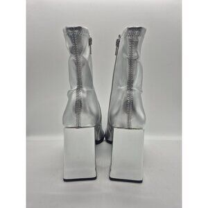 The Gianni Bini Women's Boots Size 7.5 in Silver Mirror are a stylish and elegant choice for formal occasions. With a square toe and ultra-high block heel, these ankle boots feature a zipper closure for easy wear. The synthetic upper and lining materials provide durability and comfort, making them perfect for fall, winter, and spring events like weddings and parties. The sleek silver color and metallic theme add a touch of glamour to any outfit, making these boots a versatile and chic addition to your wardrobe. They have some scratches, please look at the photos. New whit defects