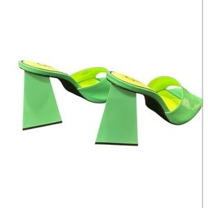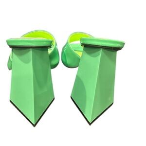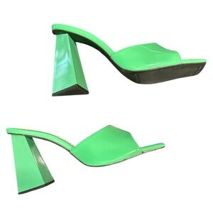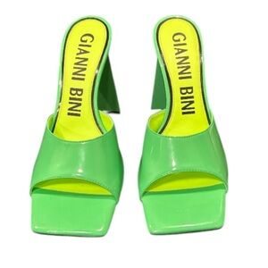Gianni Bini Caylor NWOB Vibrant Green Square Toe asymmetrical triangle 3.5" heel Sandal. Features patent leather slip on memory foam design. Perfect for adding a pop of color to any outfit.