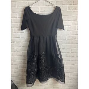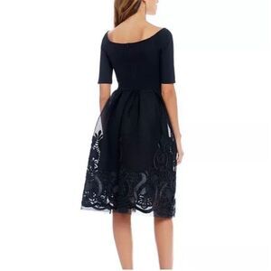 Turn heads at your next event with this stunning Gianni Bini off-shoulder cocktail dress. The elegant black midi dress is adorned with exquisite embroidered floral detailing, creating a captivating look perfect for any party or cocktail occasion. The off-the-shoulder neckline and flattering fit enhance your silhouette, while the zip closure ensures a seamless finish. Crafted from a blend of rayon, nylon, spandex, and polyester, this dress offers both comfort and style. New with tags, it's ready to make its debut in your wardrobe.