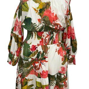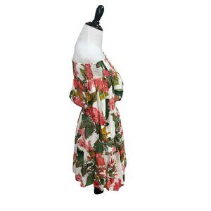 Gianni Bini Women's Off the Shoulder Blouson Dress in Size Small. Smocked Neckline, smocked waist and smocked sleeves. Beautiful Hibiscus Flower tropical Print. The fabric is 100% Rayon. Great Condition, no flaws.