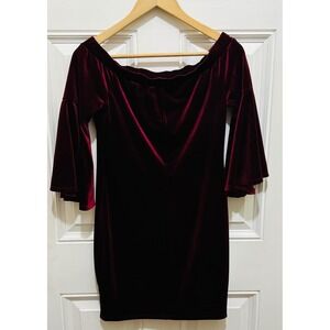 Keywords: velvet dress, off shoulder, bell sleeve, party dress, cocktail dress, mini dress, womens dress, gianni bini, red dress, 3/4 sleeve dress, evening dress, special occasion, date night dress