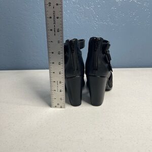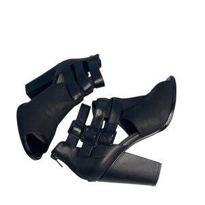 Gianni Bini black leather triple buckle strap block back zip open toe heels 9M