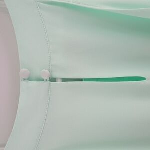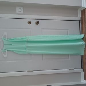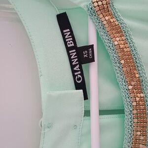 Gianni Bini bright mint green formal/semi formal dress size XS. Gold/brass details on the neckline, keyhole back. Halter top style with button closure. Loose fit waist, elastic with ruffles.