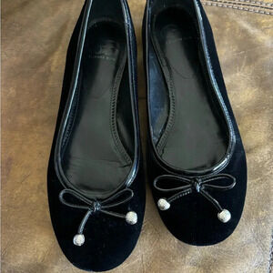These are black suede flats with a bow accent and silver. These are so beautiful. Gently worn.