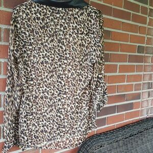 Gianni Bini leopard/animal print chiffon long sleeve sheer blouse leather trim