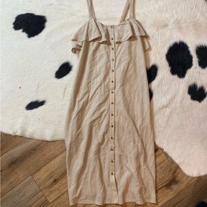 It features a midi length, thin straps, and a button-down front. Ruffled detailing is visible around the neckline and straps. Open to offers and bundle items to save!