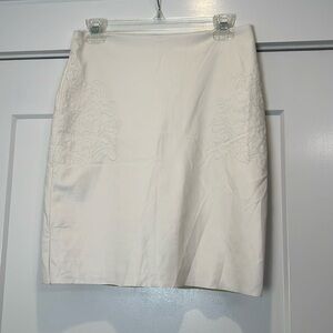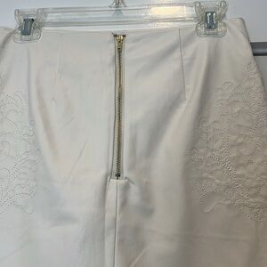 This chic off white mini pencil skirt by Gianni Bini is perfect for work or cocktail events. Its sleek, form-fitting design offers a sophisticated silhouette, while the smooth waistband ensures a polished finish. It does have a few slight imperfections due to the fact that it’s not real leather. There are a few cracks In the pleather at the top of the waistband and where it probably hung on a hanger. It is slight but I did want to point that out. Please see pics for reference.