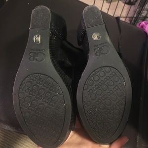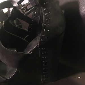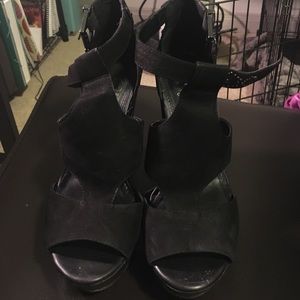 Comfortable black wedges, about a 5" heel with platform, jeweled heels and ankle straps. Bought for a cruise and worn twice, just too big on me. Perfect condition.