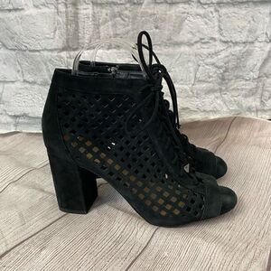 Gianni Bini women 8.5 open toe side zip cage block heels black microsuede