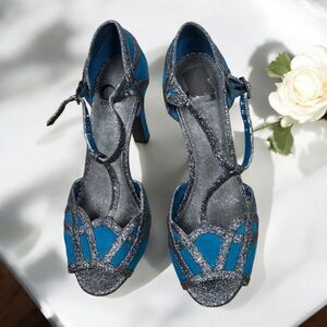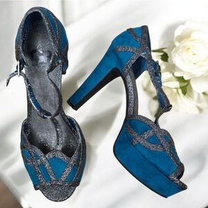 Be bold in this peep-toe sparkly heel. Features black glitter details and a gorgeous teal suede to bring extra attitude for work or special occasions.