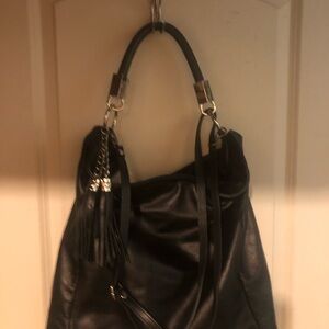 This elegant black leather tote bag is perfect for any occasion. Its sleek design and high-quality material make it a must-have accessory. The bag features a stylish tassel and sturdy handles for easy carrying