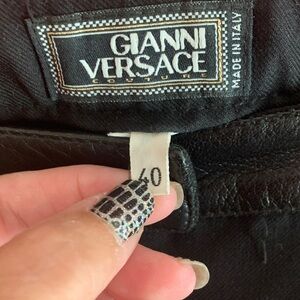Gianni Versace EU size 40 beautiful black dress pants that feature a leather finish on the waistband. Ideal for formal events. Waist 15”