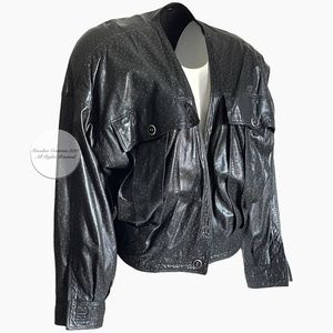 Preowned, vintage & authentic Gianni Versace Black Leather Bomber Jacket. Light dot print, see pic 3 close up. Fully-lined. Preowned/vintage w/minimal signs of prior wear: one button is missing from the wearer's left sleeve bottom. No size tag, fits like medium: shoulders - 17", bust - 38", waist - 28", sleeves - 25", length - 22". Made in Italy.